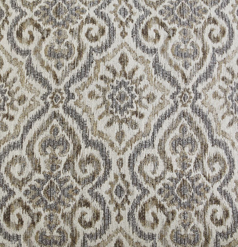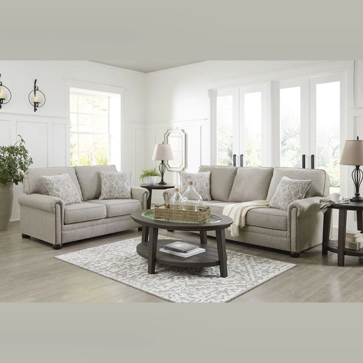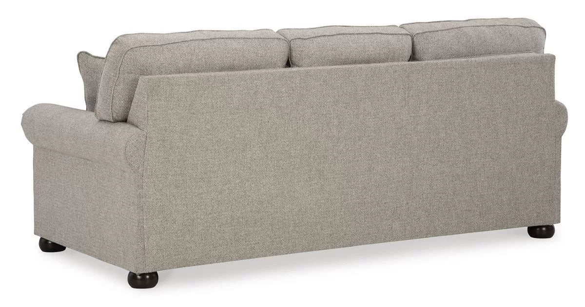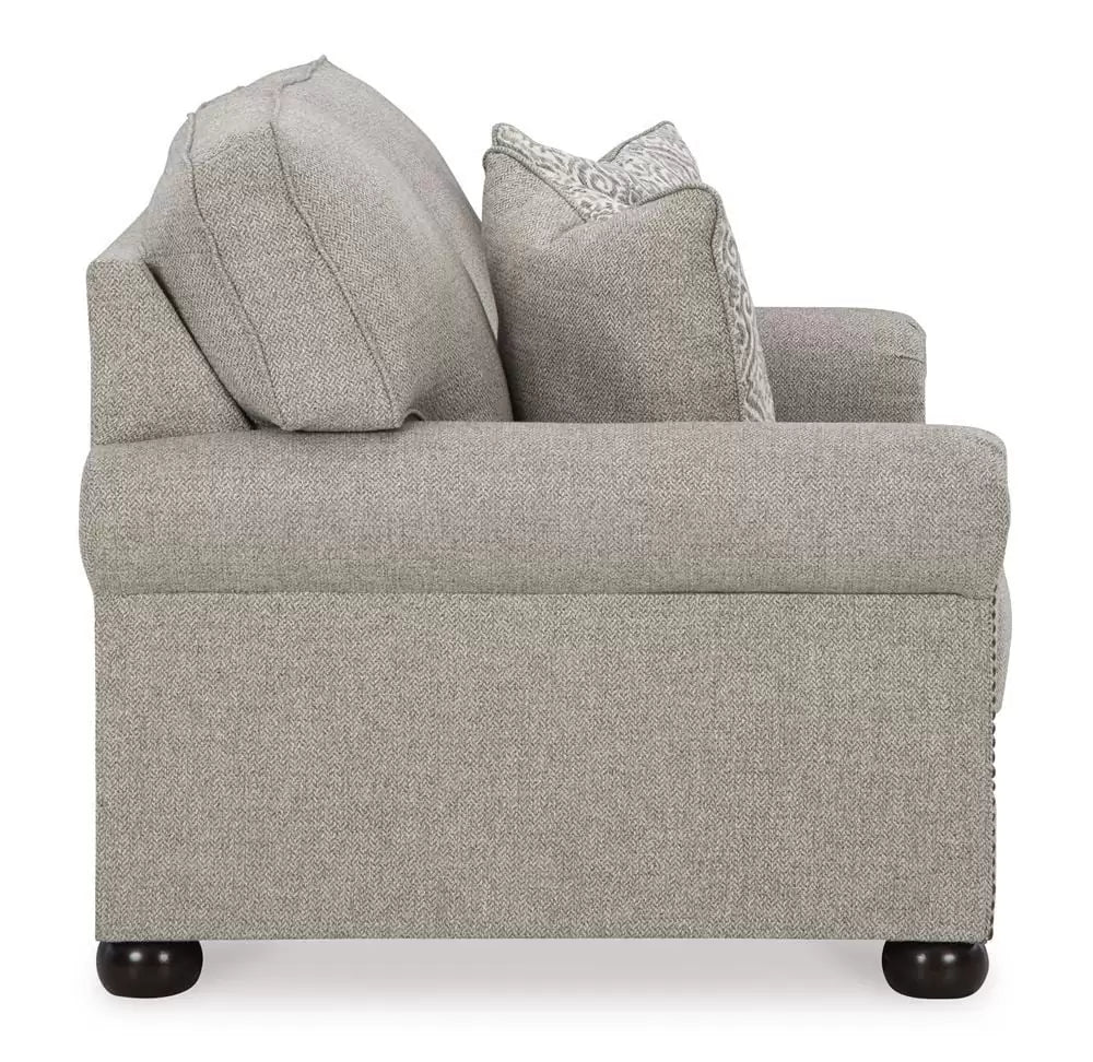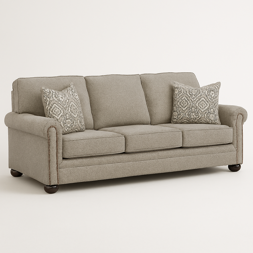 Oatmeal beige herringbone upholstery. Elegant rolled arms & bun feet. Decorative nail head trim. Includes scatter cushions.