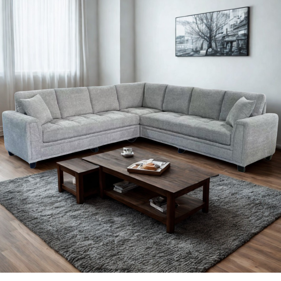 Elevate your living space with this modern L-shaped fabric sofa, designed for both style and comfort. Upholstered in a soft light grey fabric, it features deep tufted seat cushions, plush backrests, and supportive armrests for a relaxing seating experience. The sturdy frame and solid legs provide durability, making it a perfect centrepiece for any contemporary home or office lounge.