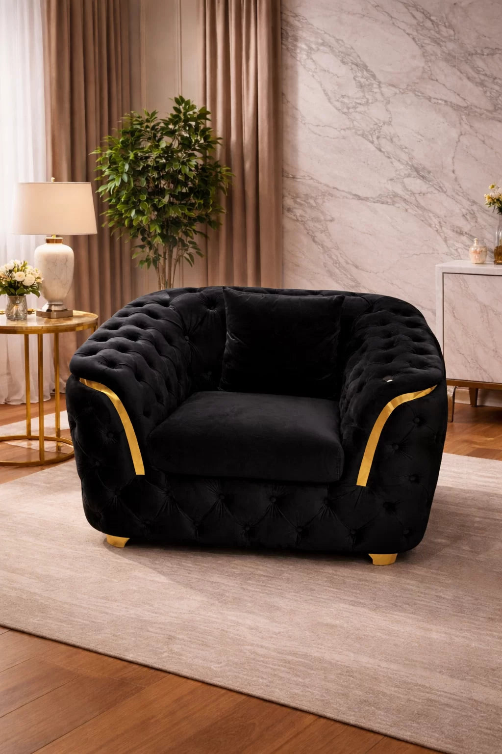 Add a touch of luxury to any room with the LUCY 1-Seater Armchair. With its timeless design velvet fabric and comfortable cushioning this statement armchair brings elegance and relaxation together in one perfect seat.